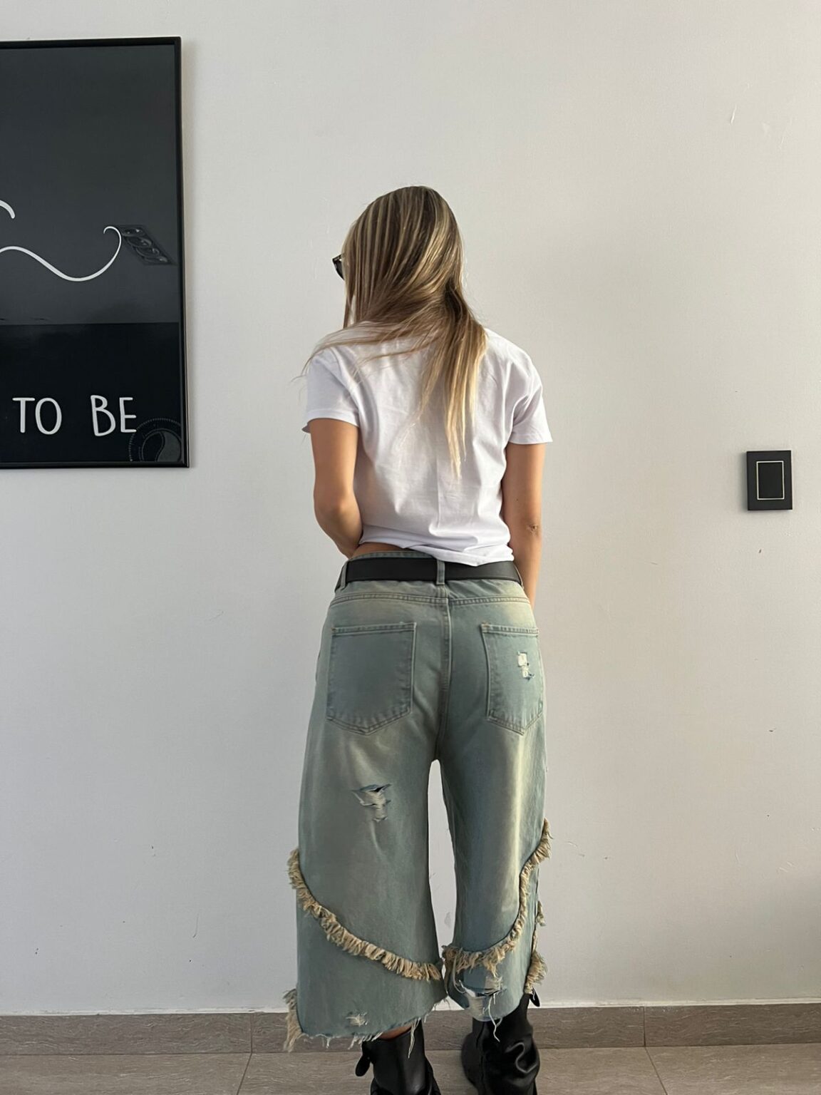 Bermuda tiro bajo con diseño intervenido en diagonales, estilo urbano y súper canchero. Fit cómodo y relajado, ideal para looks casuales.