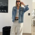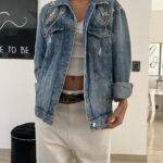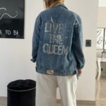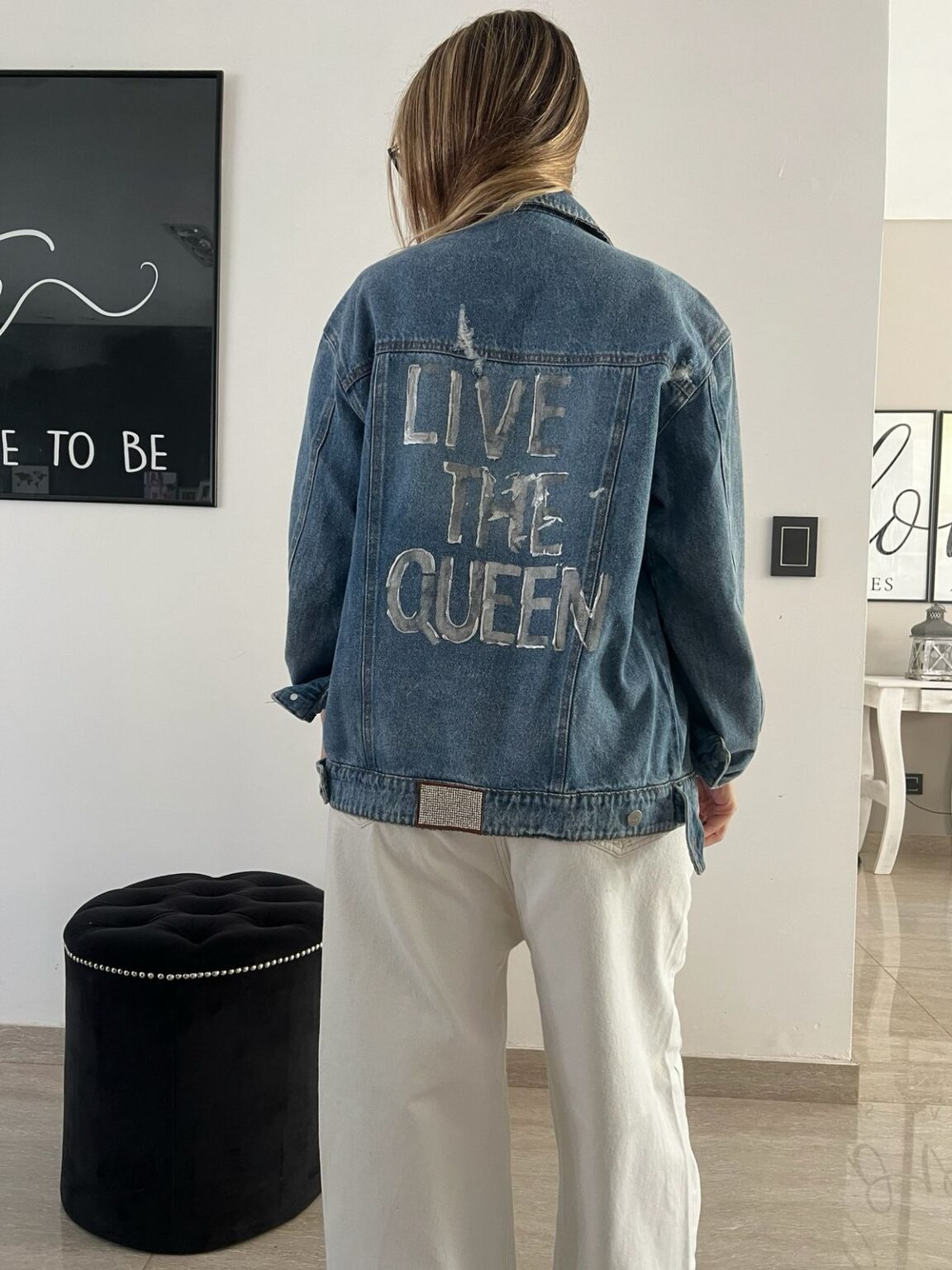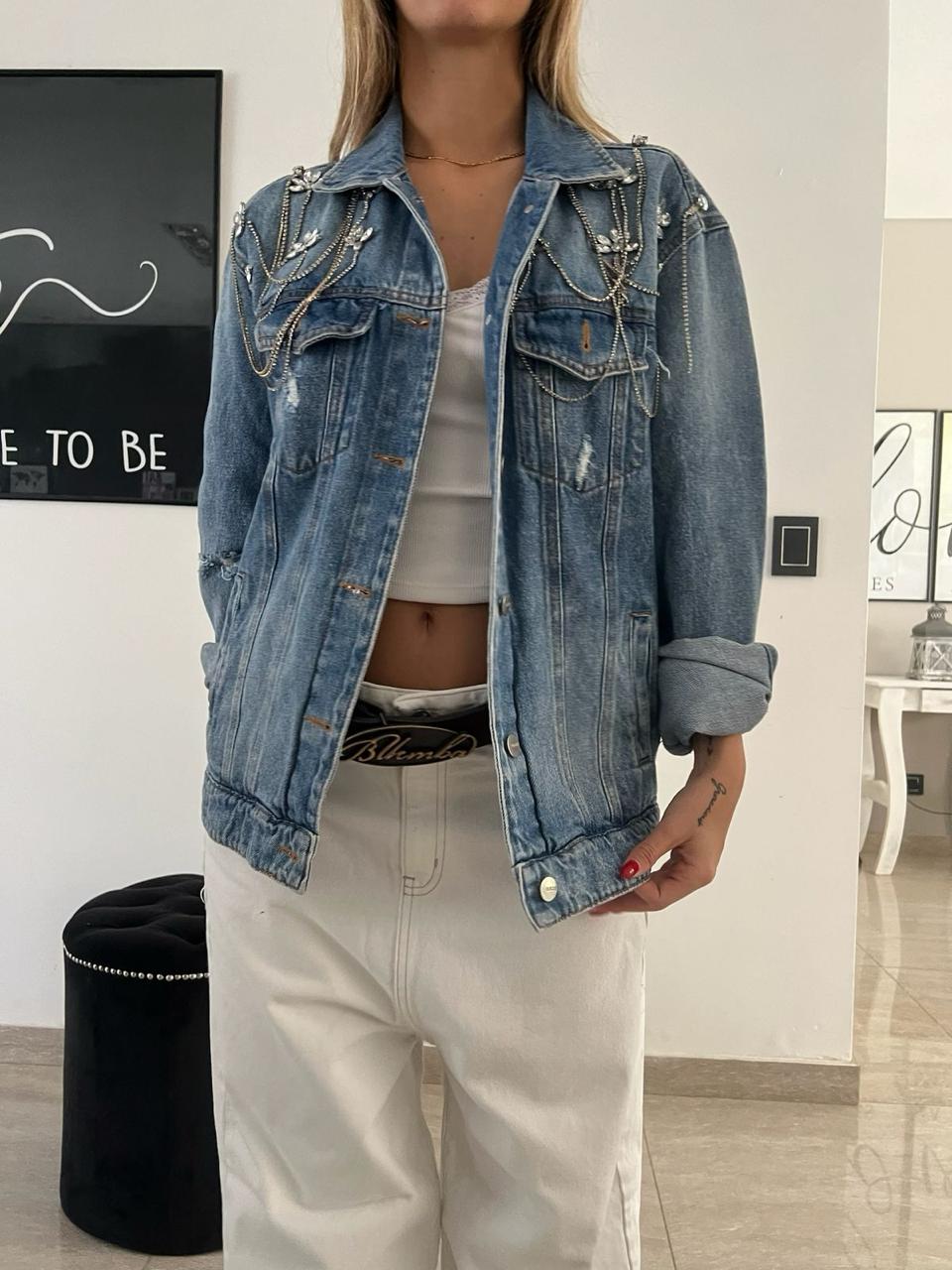 Campera denim oversize con cadenas y strass en el frente y detalles intervenidos en la espalda. Diseño artesanal, única y súper canchera.