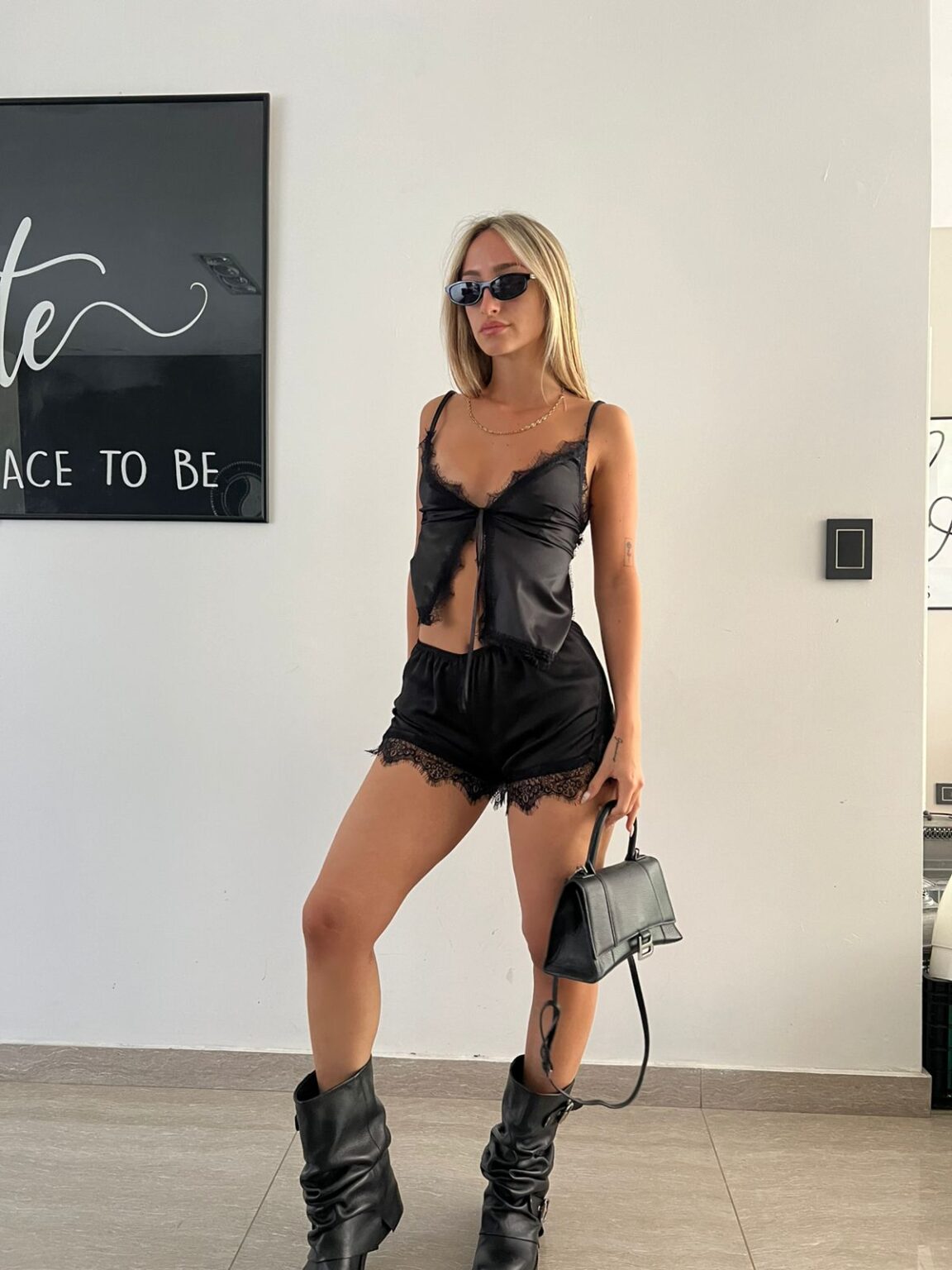 Conjunto de seda satinada con detalles de encaje. El top tiene tirantes finos, nudo frontal y terminaciones delicadas, mientras que el short incluye cintura elastizada y puntilla en el ruedo. Suave, sensual y moderno, ideal para looks urbanos con un toque atrevido.