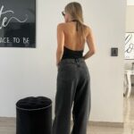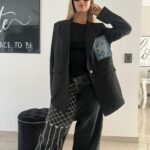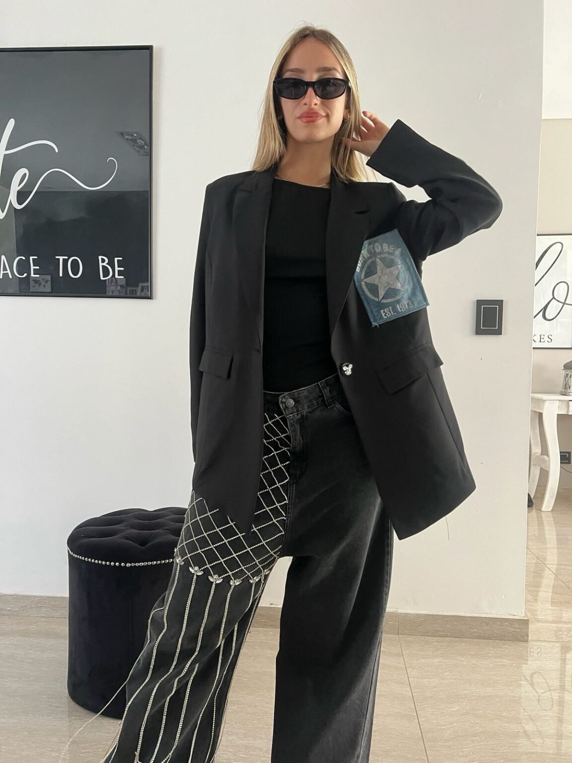 Pantalón con diseño artesanal de rombos en strass y tiro caído, súper original y protagonista. Ideal para looks de noche o streetstyle.
