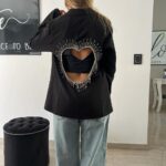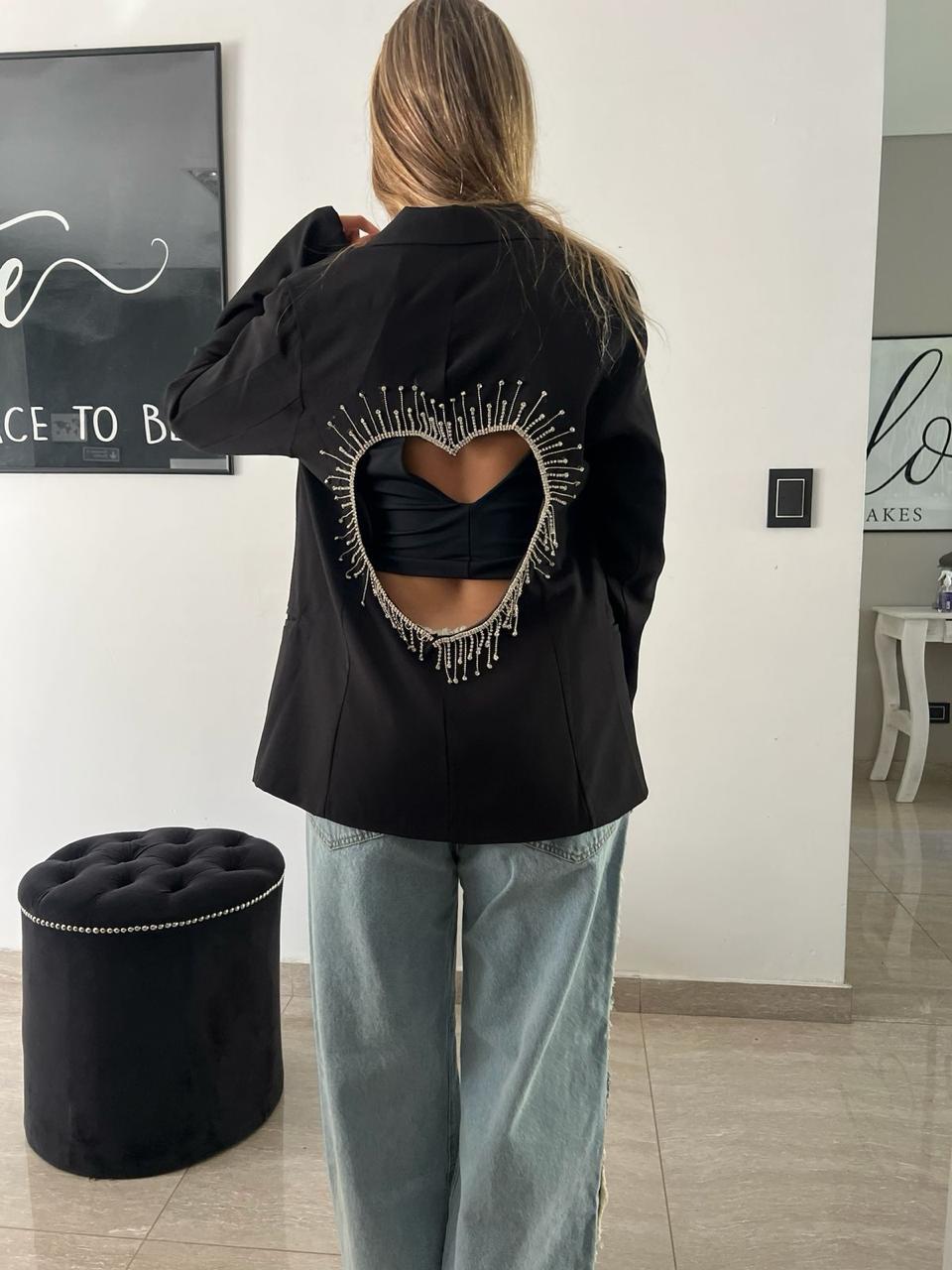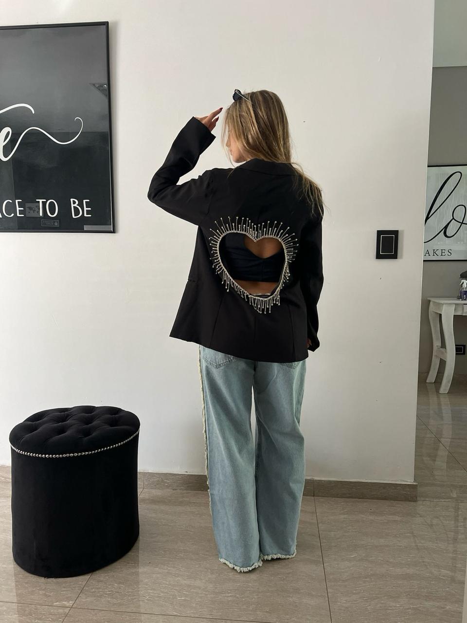 Saco artesanal con recorte en forma de corazón en la espalda y apliques bordados a mano. Una prenda única, súper canchera y protagonista en cualquier look.