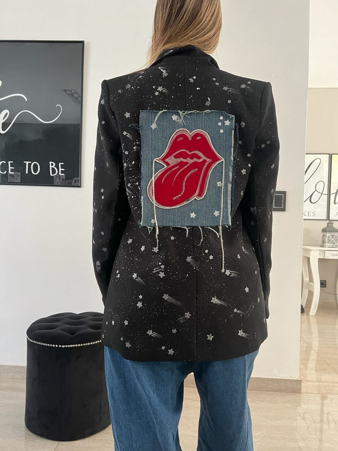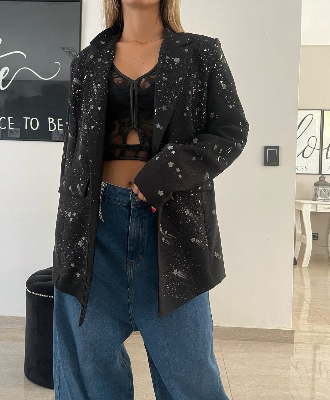 Saco artesanal con estampa de estrellas y parche bordado en la espalda estilo rock. Corte moderno, liviano y súper canchero para elevar cualquier look.