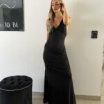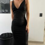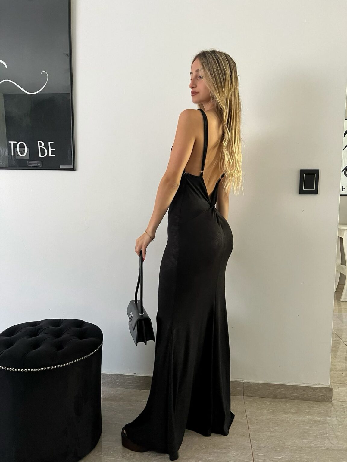 Vestido largo confeccionado en tela súper spandex, que se adapta a varios talles por su elasticidad y caída. Diseño cómodo y versátil, con escote profundo y espalda súper cavada que estiliza la figura.