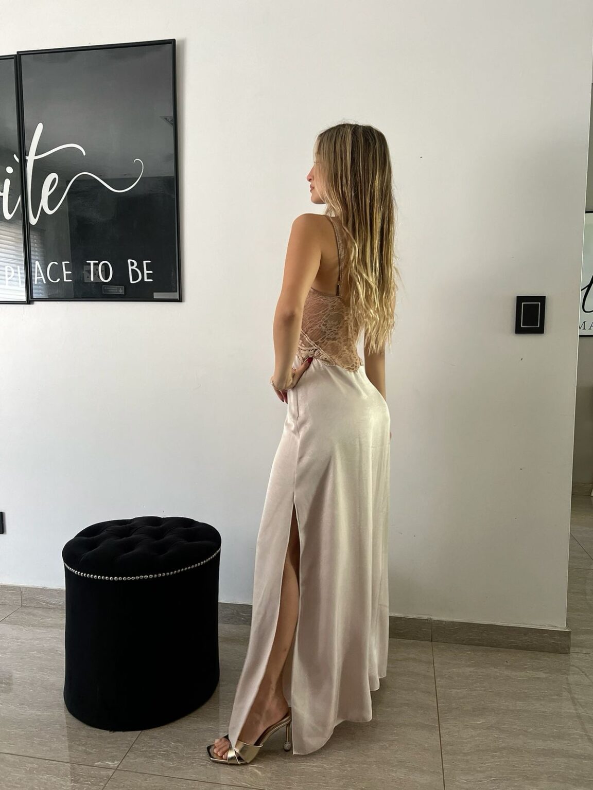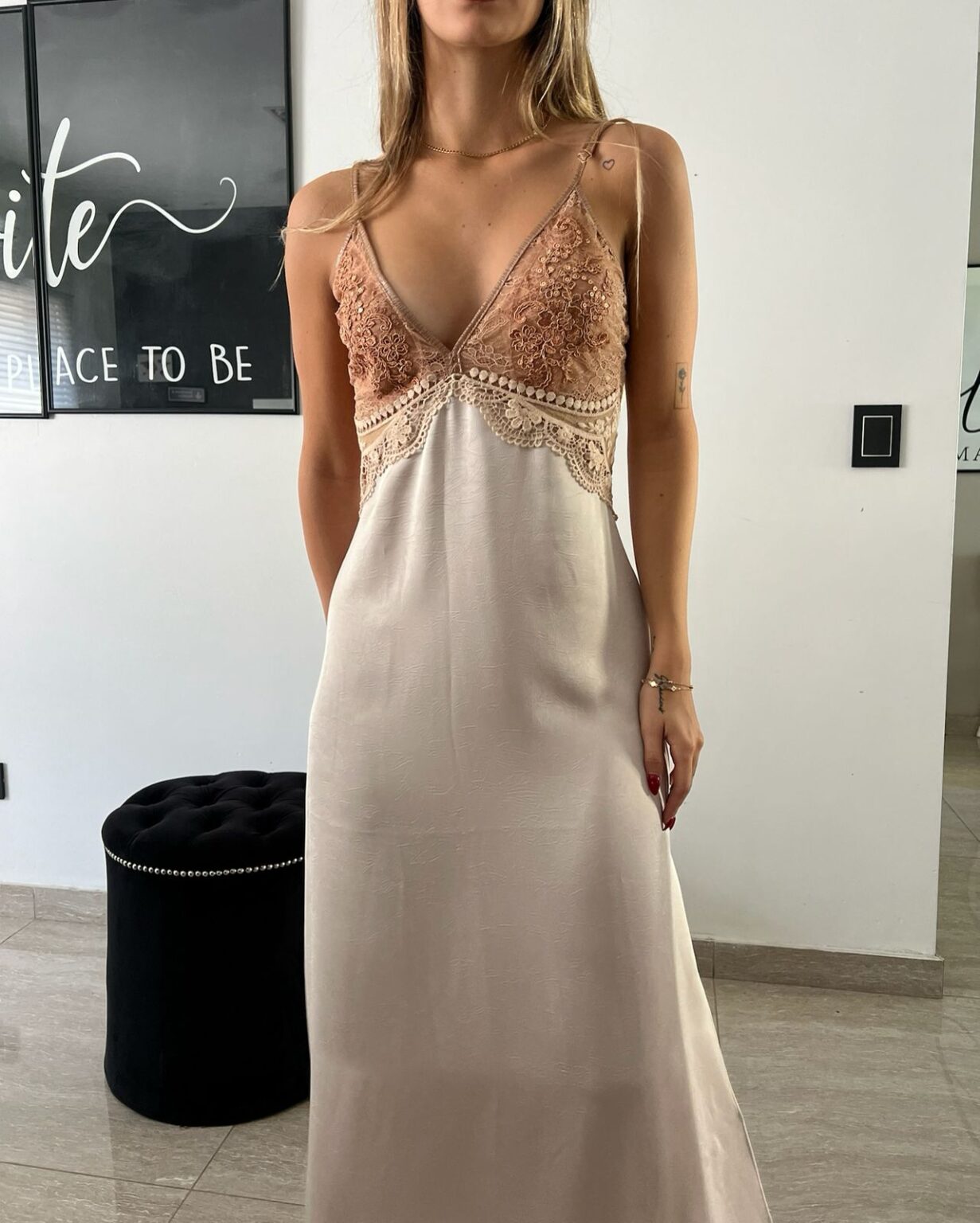 Vestido largo confeccionado en seda suave color crudo. El busto está realizado en encaje bordado con apliques importados de la India y detalle de puntilla bajo el busto. Breteles finos regulables y tajo lateral que estiliza la figura. Incluye forrería interna para mayor comodidad.