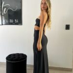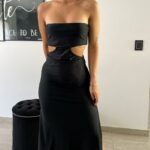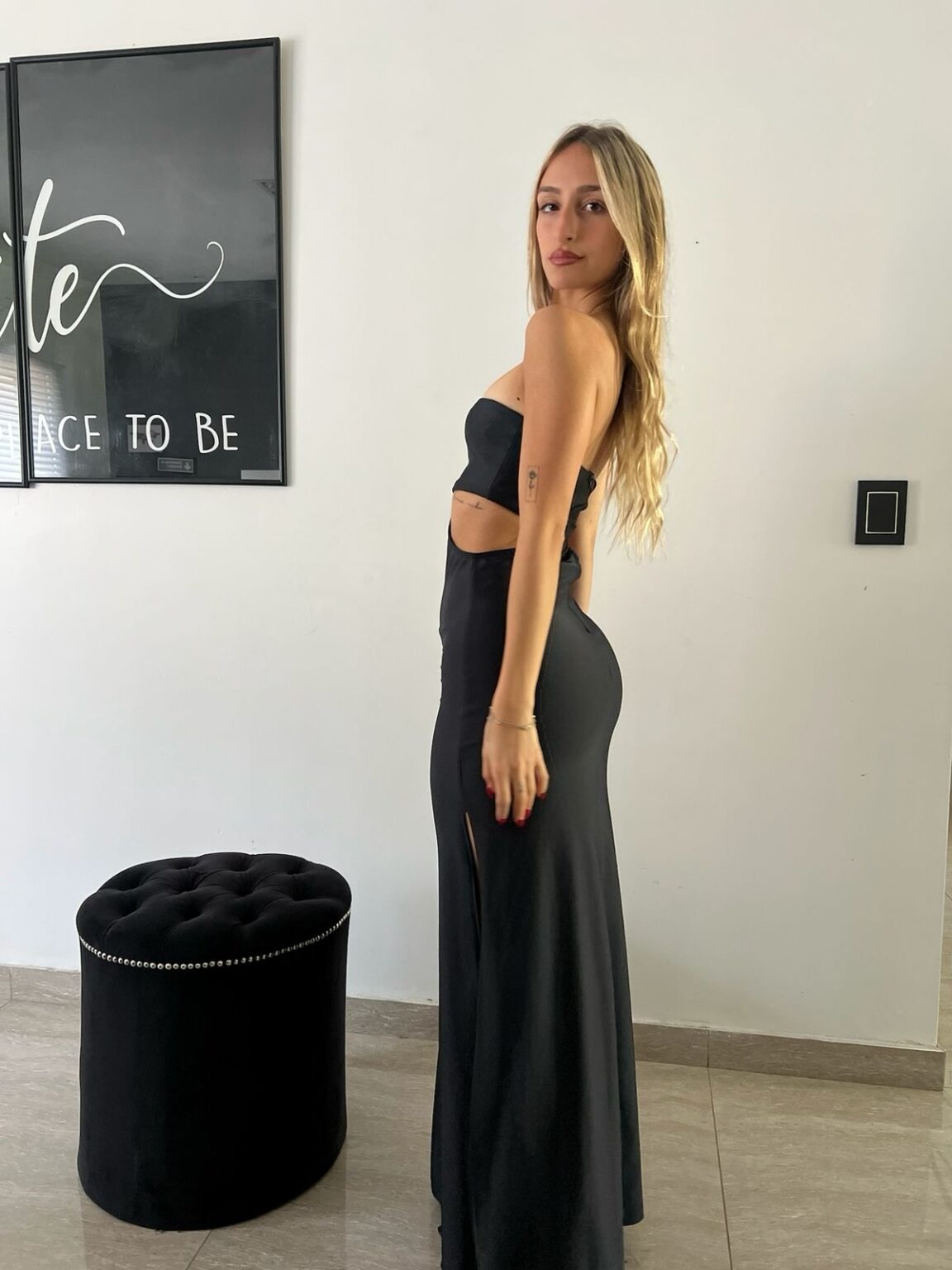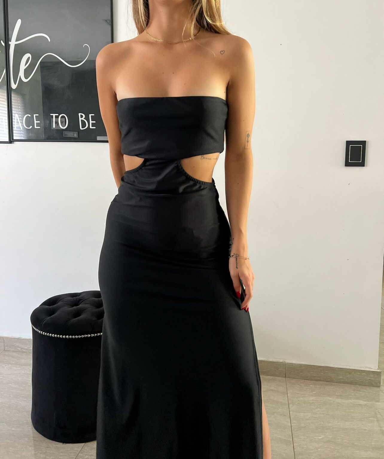 Vestido largo confeccionado en tricot, con ballenas laterales que sostienen y mantienen la forma del busto. Incluye lazo ajustable y cut-outs laterales que estilizan la figura. Caída suave y tajo lateral.